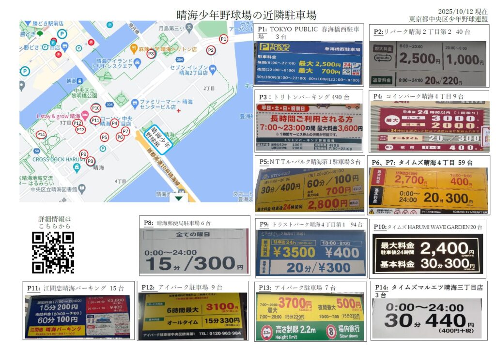 ・荒川区少年運動場・野球場(無料駐車場有) ・東尾久運動場多目的広場(有料駐車場有) ・都立汐入公園多目的広場(有料駐車場有) ・若洲グランド(江東区若洲1-1-9)(無料駐車場有) ・晴海少年野球場(中央区晴海2-4-27) 駐車場ありません! ※晴海少年における乗降についての注意事項 晴海少年の利用について_20251009ダウンロード 晴海少年野球場 近隣パーキング情報